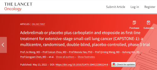 北京时间2022年5月14日,BBIN宝盈医药自主研发的PD-L1抑制剂阿得贝利单抗治疗广泛期小细胞肺癌的III期临床研究(CAPSTONE-1研究)成果正式全文在线发表于国际权威学术期刊《柳叶刀·肿瘤学》(《THE LANCET Oncology》,影响因子41.316)。CAPSTONE-1研究结果显示,阿得贝利单抗联合化疗一线治疗广泛期小细胞肺癌相较于安慰剂联合化疗可以显著延长患者总生存期至15.3个月[1],刷新现有免疫药物一线治疗广泛期小细胞肺癌的总生存纪录[2]。